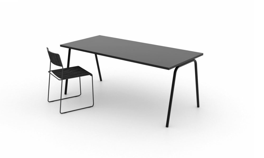 Bordsskivan finns i svart linuleum på toppen och kanterna eller vitt, grått eller svart laminat med ABS kantlister.