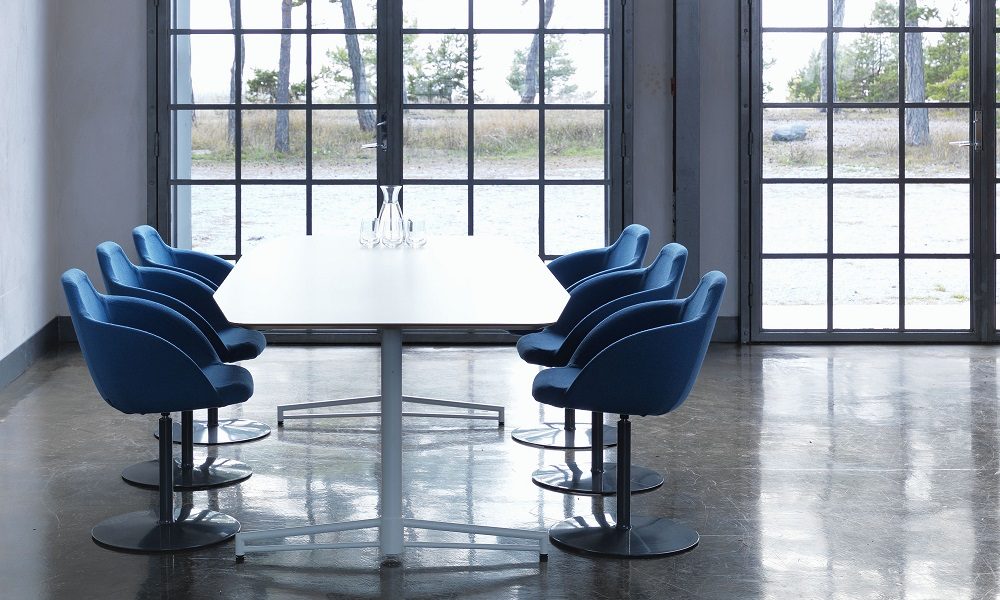 Komplettera bordet med konferensstolar och god arbetsbelysning i form av taklampor.