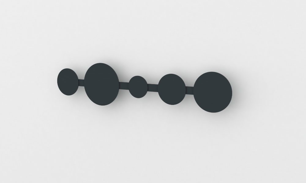 FM klädhängare består av fem cirklar i olika storlekar med diameter på 60, 80, 100 och 120 mm.