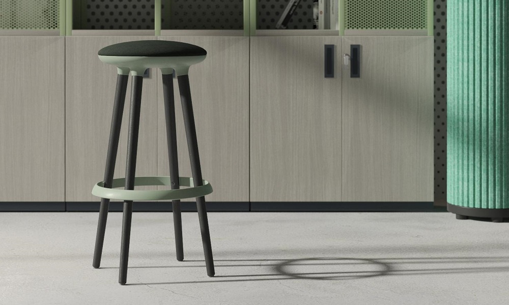 Den lätta basen i ask och det färgglada fotstödet gör pallen bekväm – perfekt för kontoret. Sitsen är vadderad för ännu högre komfort.