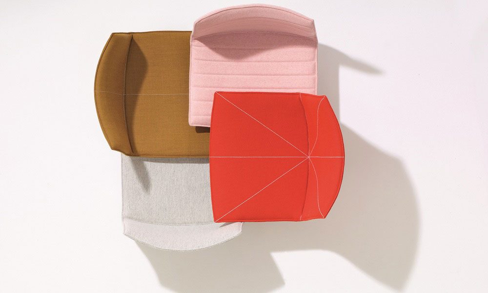 Sits och rygg i dubbelkrökt plywood, mono-och -bi-färgad polypropylen samt klädd i tyg och läder.